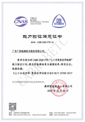 近日,廣東廣紡檢測(cè)技術(shù)股份有限公司(以下簡(jiǎn)稱“廣紡檢測(cè)”)參加建研院檢測(cè)中心有限公司組織的土工合成材料領(lǐng)域能力驗(yàn)證項(xiàng)目,獲得能力驗(yàn)證滿意證書。